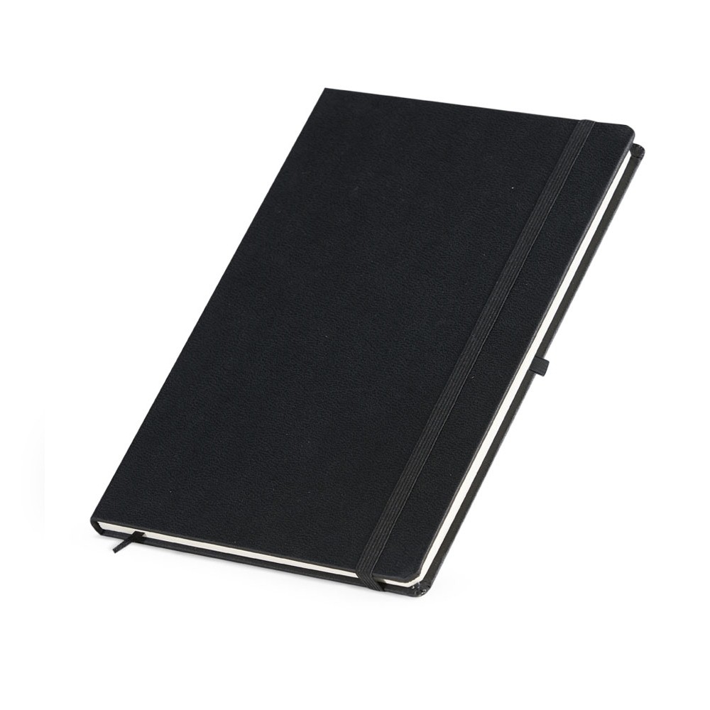 Caderneta em percalux com marcador de página em cetim e fita elástica para fechar. Contém aproximadamente 80 folhas sem pauta.
