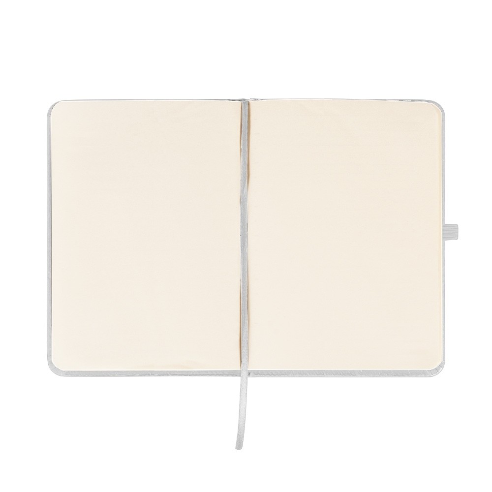 Caderneta emborrachada com elástico para lacre, marcador de página em cetim e porta caneta, contém aproximadamente 84 folhas marfim sem pauta.