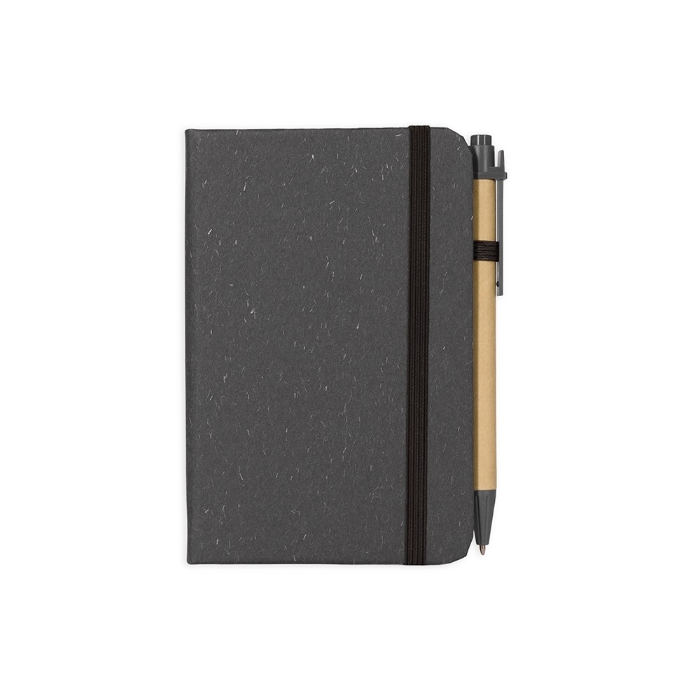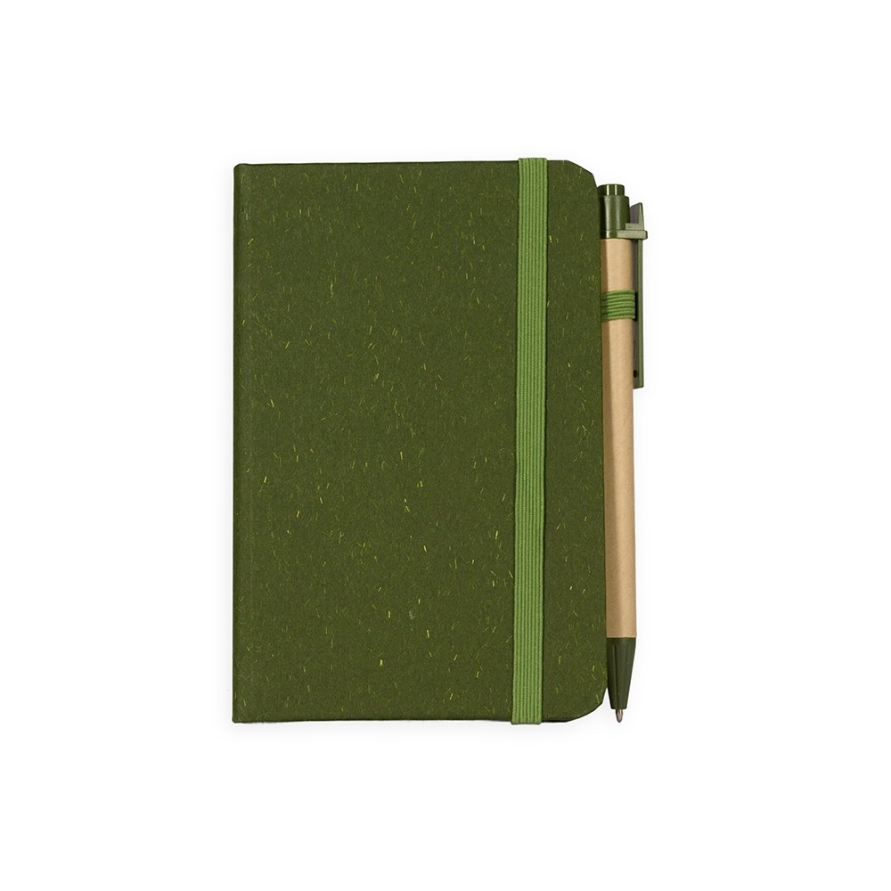 Caderneta ecológica de capa dura revestida em fibra de palha de trigo. Contém aproximadamente 80 folhas brancas com pauta, além de duas folhas de guarda, uma fita para fechamento e porta-canetas elástico. Acompanha uma caneta esferográfica de carga azul de 1,0mm com corpo em papelão e clip, acionamento por clique e ponteira em plástico.