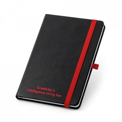 Caderno A5 de capa dura em PU com substrato colorido permitindo a gravação a laser da cor do elástico. Contém 160 páginas pautadas, elástico, fita separadora, suporte para esferográfica (não inclusa) e bolso em papel na parte traseira da capa. 140 x 210 mm