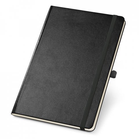 Caderno A5 de capa dura em PVC com 160 páginas pontilhadas em cor marfim, elástico, fita separadora, bolso interior e suporte para esferográfica (não inclusa). 137 x 210 mm