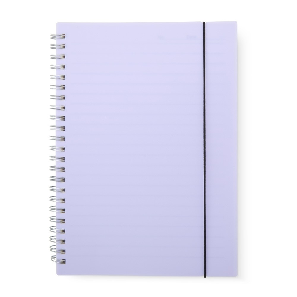 Caderno A5 com capa plástica e elástico para lacre, contém aproximadamente 80 folhas marfim com pauta.