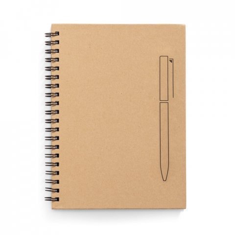 Caderno B6 espiral com capa dura em papel kraft. Contém 140 páginas lisas em papel pedra (120 g/m²) e imã na capa que funciona como um suporte de esferográfica (não inclusa). 130 x 180 mm