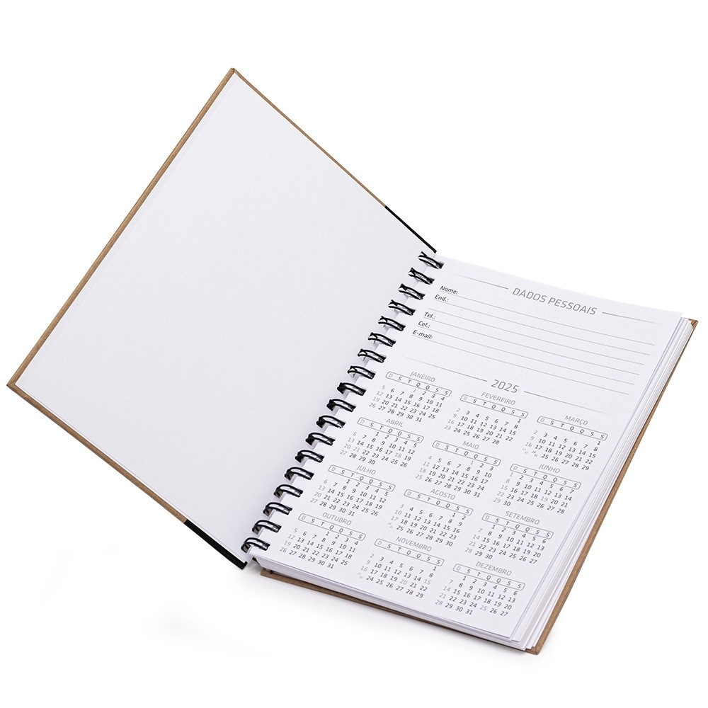 Caderno com capa kraft e espiral metálico. Possui aproximadamente 85 folhas brancas pautadas e folhas destinadas aos dados pessoais, calendário de 2024 à 2026, planejamento e contatos.
