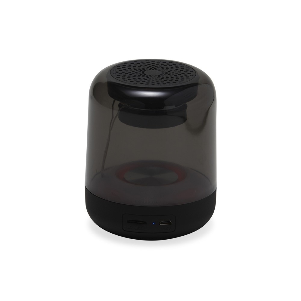 Caixa de som multimídia em plástico com iluminação em LED. Conta com painel de botões localizado na base que permite controlar os modos de conexão Bluetooth 5.3, rádio FM e reprodução de arquivos MP3 através da entrada para cartão TF (microSD). Acompanha cabo micro-USB para carregamento.