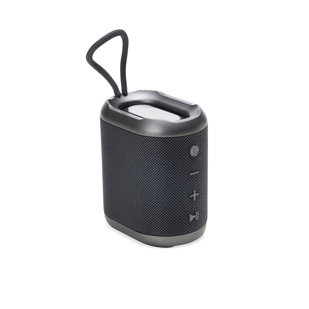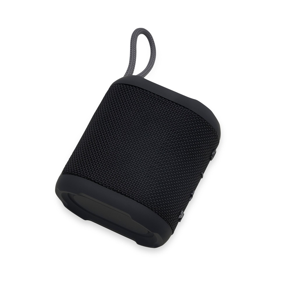 Caixa de som multimídia resistente a respingos dágua feito em plástico com acabamento em tecido. Possui conexão via Bluetooth 5.0 e compatibilidade com a tecnologia TWS, que permite sincronizar duas caixas de som ao mesmo tempo. Conta ainda com modo de reprodução de arquivos MP3 a partir das entradas para cartão TF (microSD) e USB para pen drives. Acompanha cabo Micro-USB e cabo auxiliar P2.