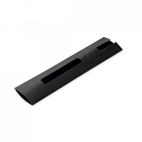 Caneta esferográfica de metal com detalhe em bambu, escrita em azul. Acompanha estojo em bambu.