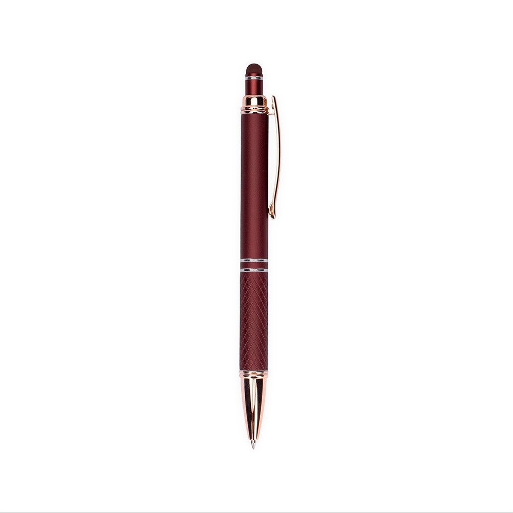 Caneta metálica touchscreen com parte inferior texturizada, acionamento por clique e carga esferográfica azul 1.0mm.