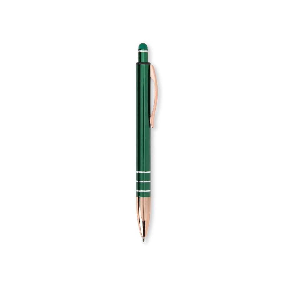 Caneta metálica com acionador touch, clipe metálico e ponteira plástica. Carga esferográfica azul 1.0mm e acionamento por clique.