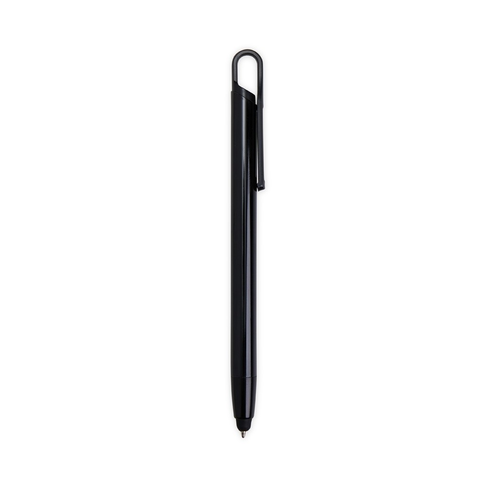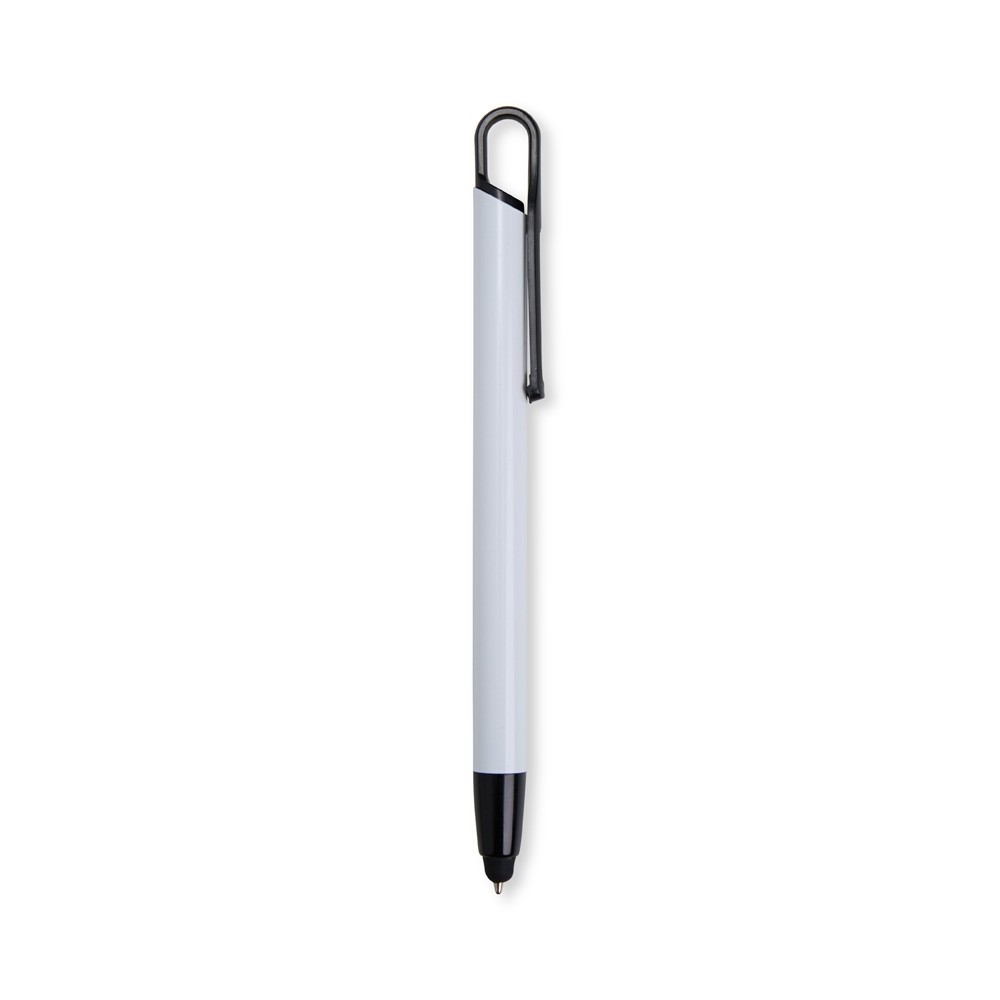 Caneta metálica com clipe plástico e ponteira touch, carga esferográfica azul 1.0mm e acionamento por clique.