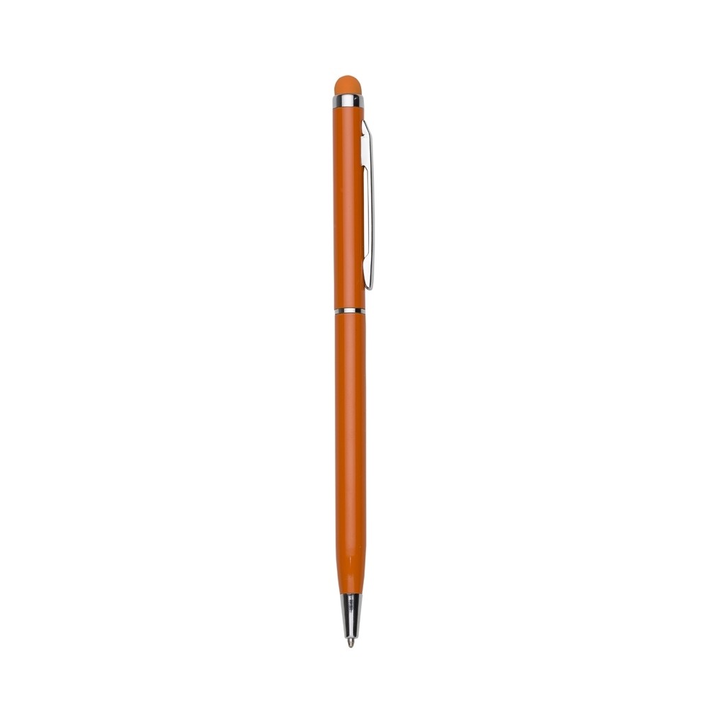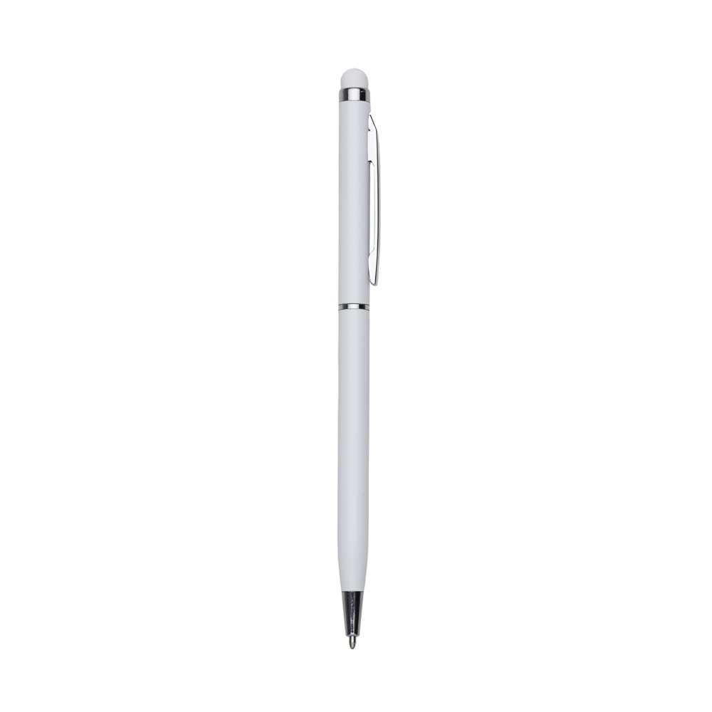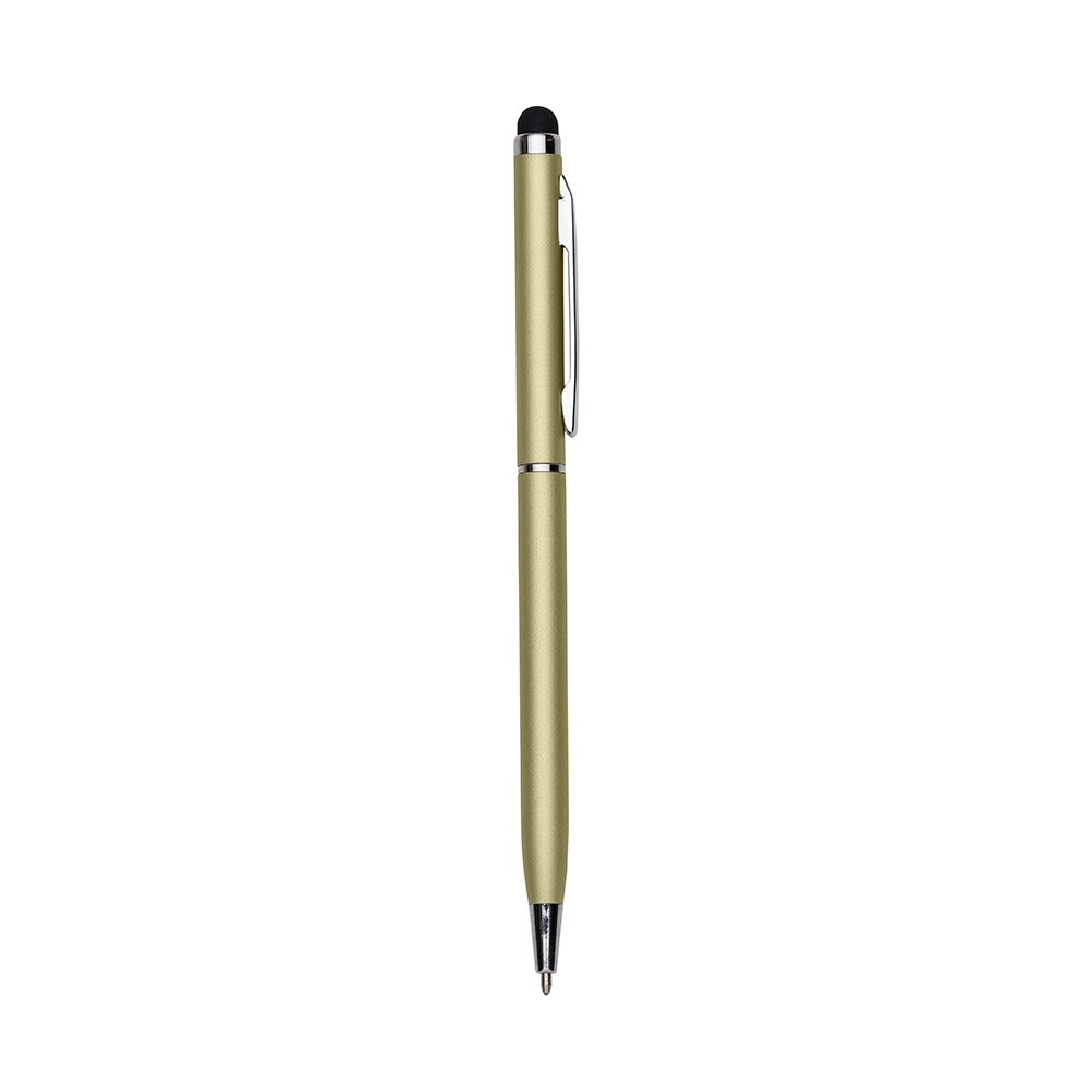 Caneta metálica com touch screen, carga esferográfica azul 1.0 mm e acionamento por rotação.