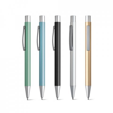 Caneta metálica com carga esferográfica azul 1.0mm e acionamento por clique.