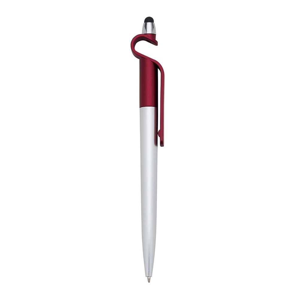Caneta plástica com suporte para celular e touch screen. Carga esferográfica azul e acionamento por rotação.