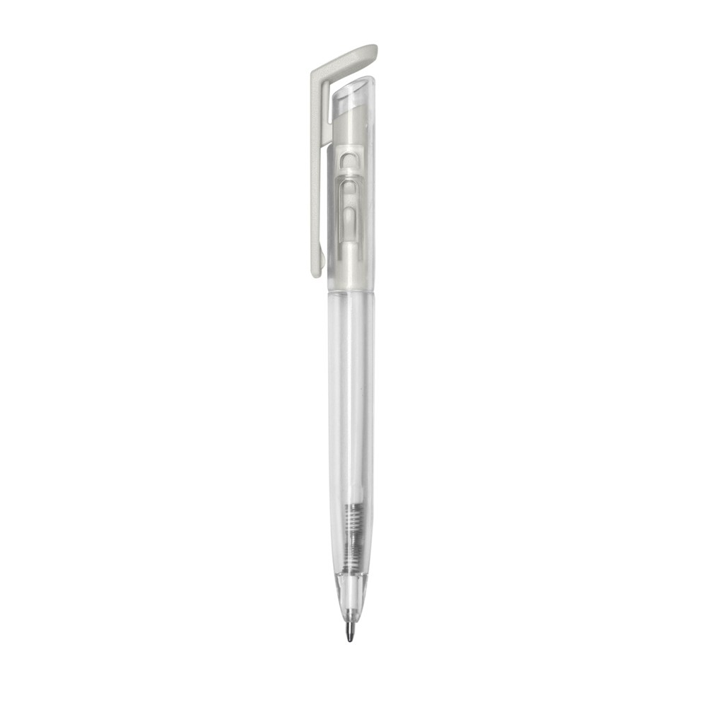 Caneta plástica com carga esferográfica azul 1.0 mm e acionamento por clique.