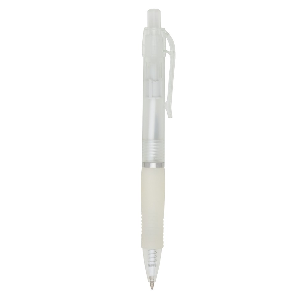 Caneta plástica com detalhe emborrachado, carga esferográfica azul 1.0 mm e acionamento por clique.