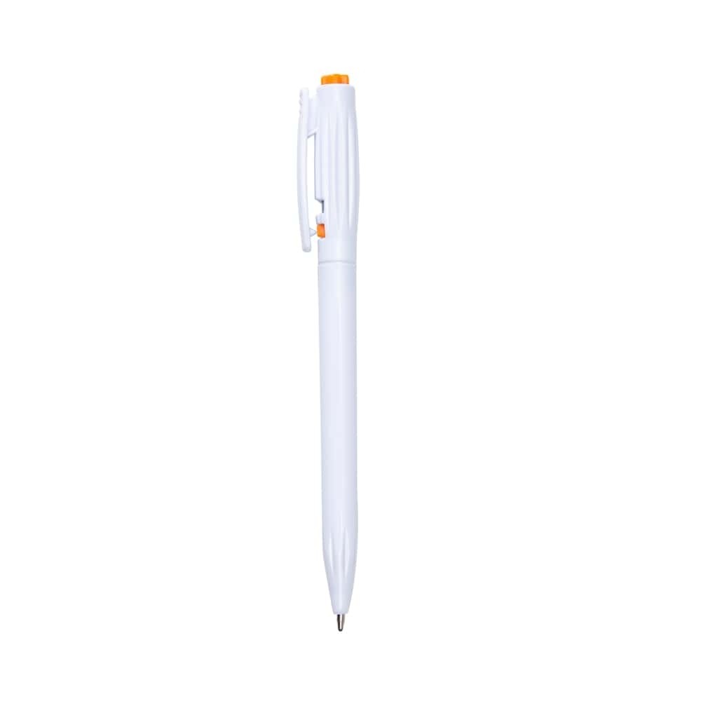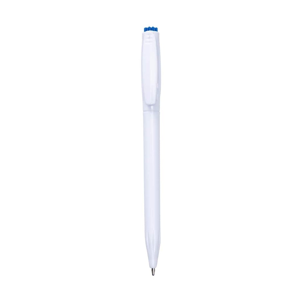 Caneta plástica com carga esferográfica azul 1.0 mm e acionamento por clique.