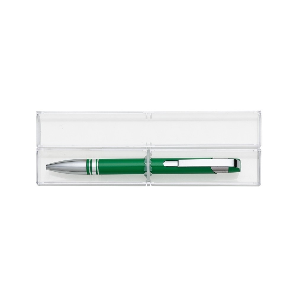 Conjunto caneta com estojo de acrílico. Caneta semimetálica com carga esferográfica azul e acionamento por clique. OBS.: PEDIDO APENAS MÚLTIPLO DE 50 PEÇAS!