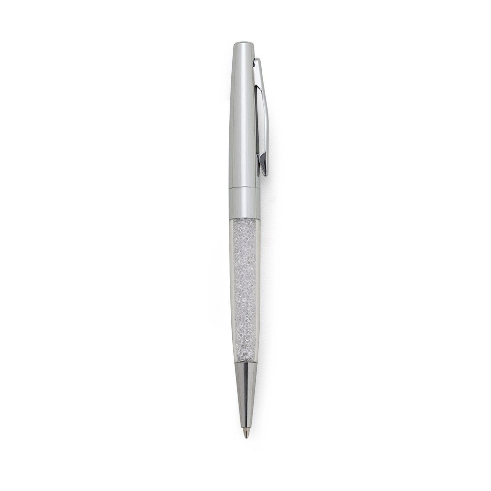 Caneta semimetálica com detalhes em cristal, carga esferográfica azul e acionamento por rotação.