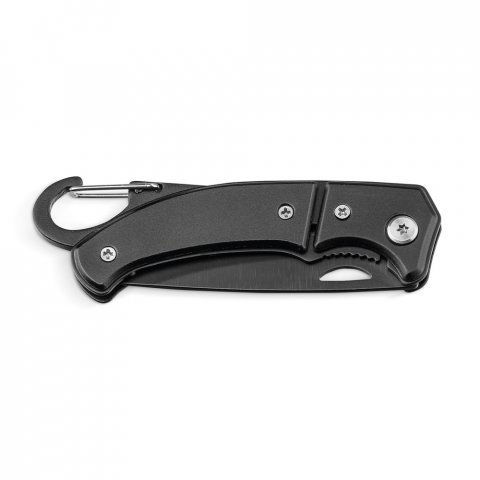Canivete em aço inox e metal com fecho de segurança e mosquetão. Fornecido em caixa presente. 101 x 10 x 29 mm | Caixa: 108 x 39 x 15 mm
