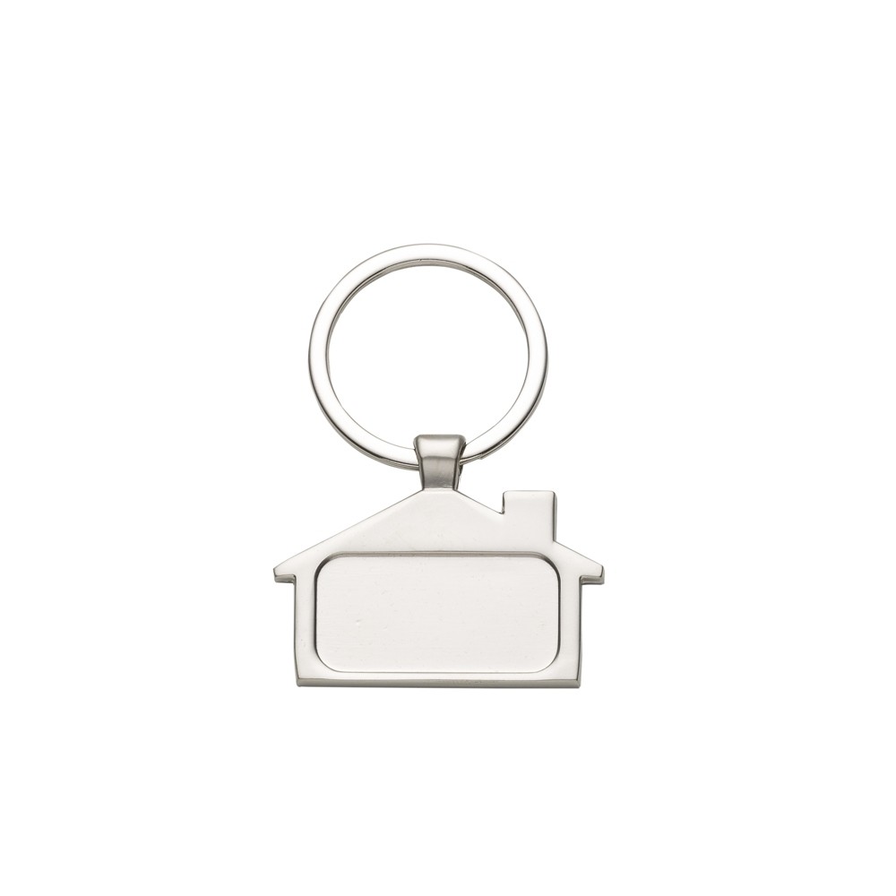 Chaveiro metal fosco formato casa. Parte frontal com desenho em relevo das janelas e portas, verso com um retângulo no centro ideal para personalização. Especificações: - Altura  6,1 cm - Largura  4,4 cm - Medidas aproximadas para gravação(CxL)  1,5 cm x 3 cm - Peso aproximado(g)  23