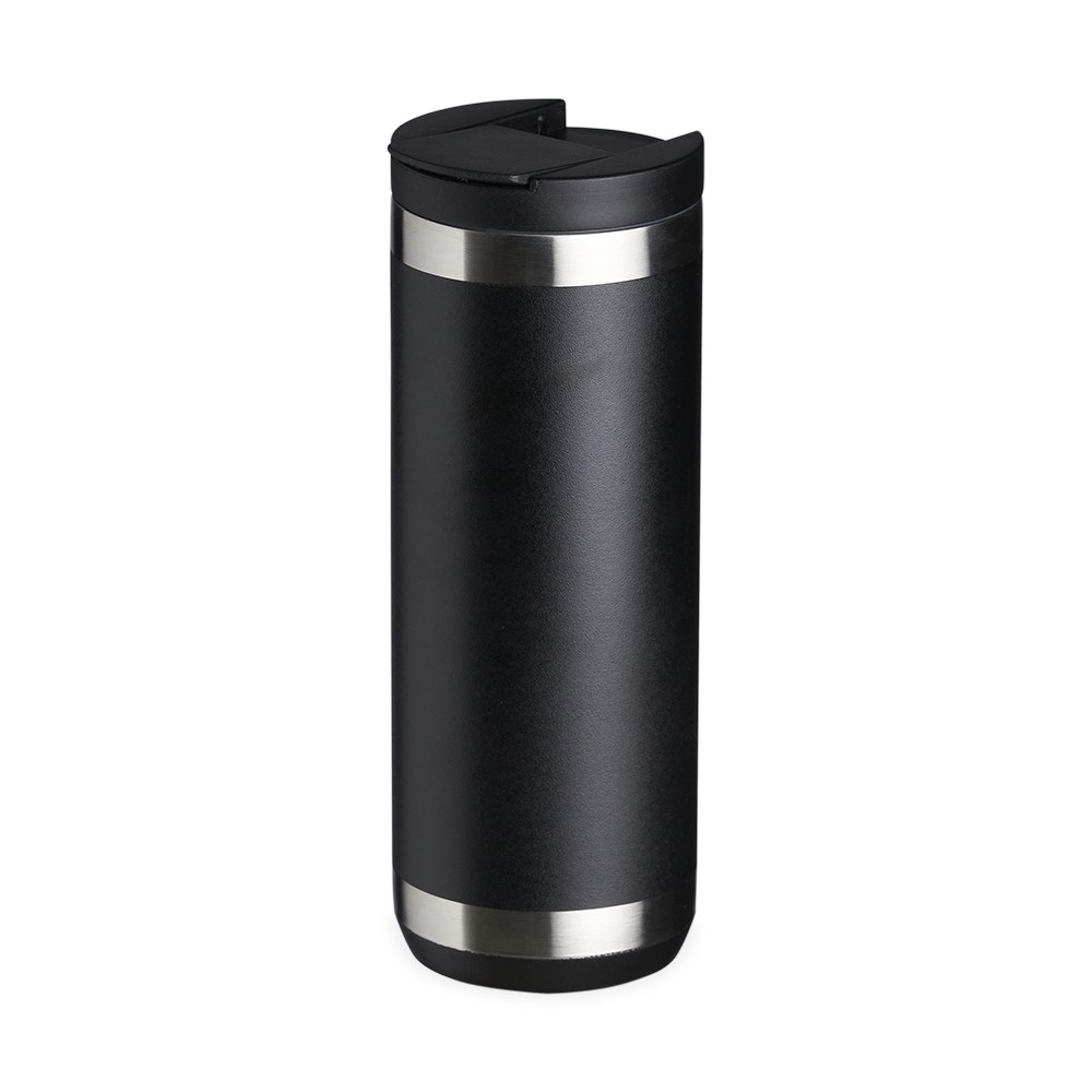 Copo térmico de inox feito de parede dupla com capacidade para 550ml. Contém tampa plástica com bocal e trava de segurança.