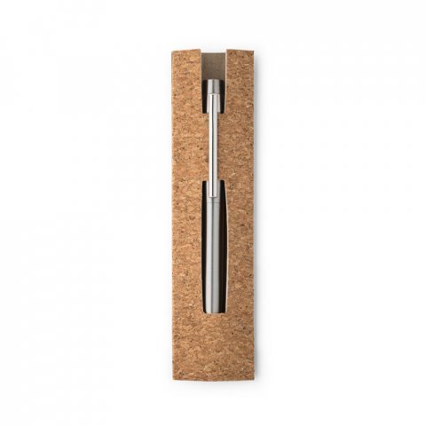 Esferográfica com corpo em aço inox 53% reciclado. A esferográfica tem clipe, mecanismo twist e escrita em azul até 1,5 km. Fornecida numa bolsa presente de cortiça. Esferográfica: ø11 x 133 mm | Bolsa: 155 x 40 mm