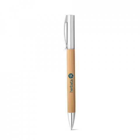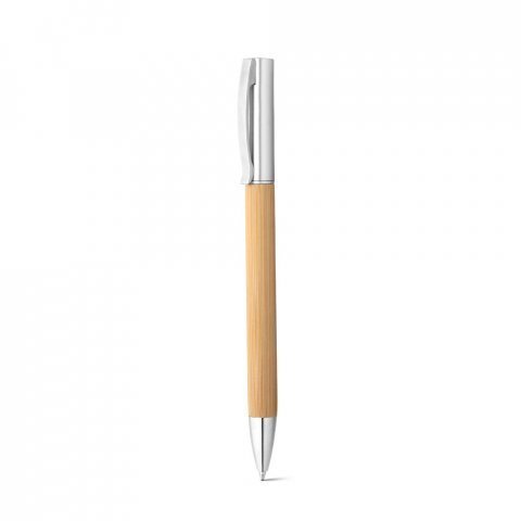 Esferográfica em bambu e ABS com acabamento metálico mate. A esferográfica tem clipe em metal, mecanismo twist e escrita em azul. A cor e o resultado da impressão nos materiais naturais pode variar entre produtos. Ø10 x 142 mm