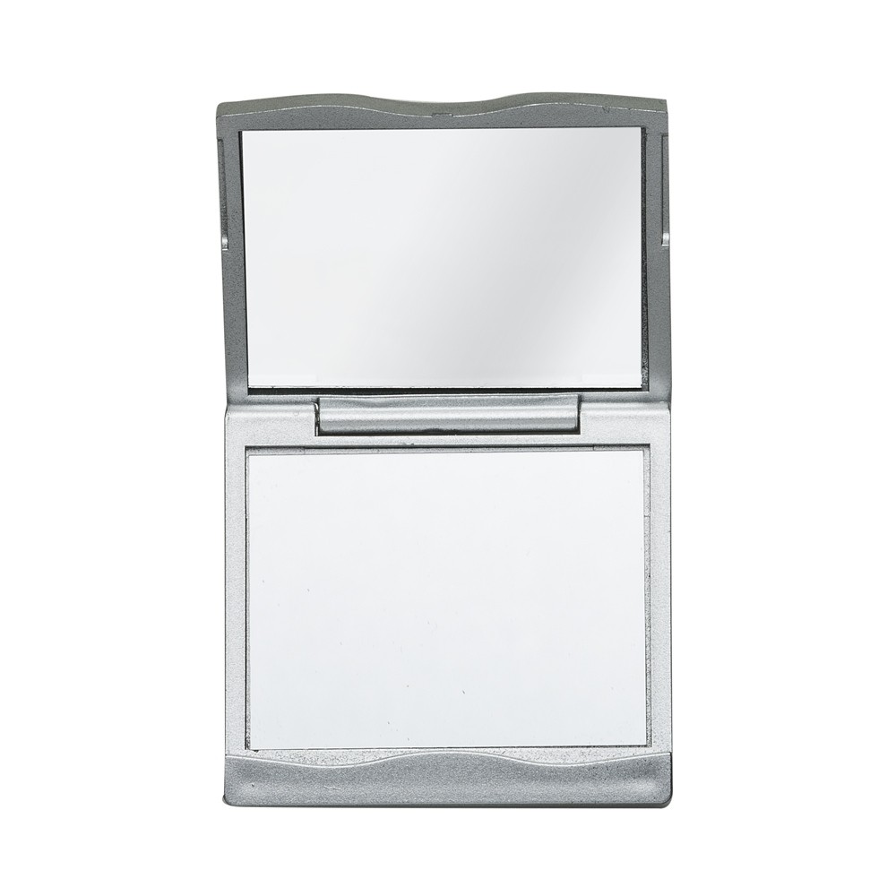 Espelho duplo compacto com moldura em plástico, detalhe ondulado na área da abertura e tampa de formato curvo. Possui dois espelhos: o superior sem aumento e o inferior com aumento.