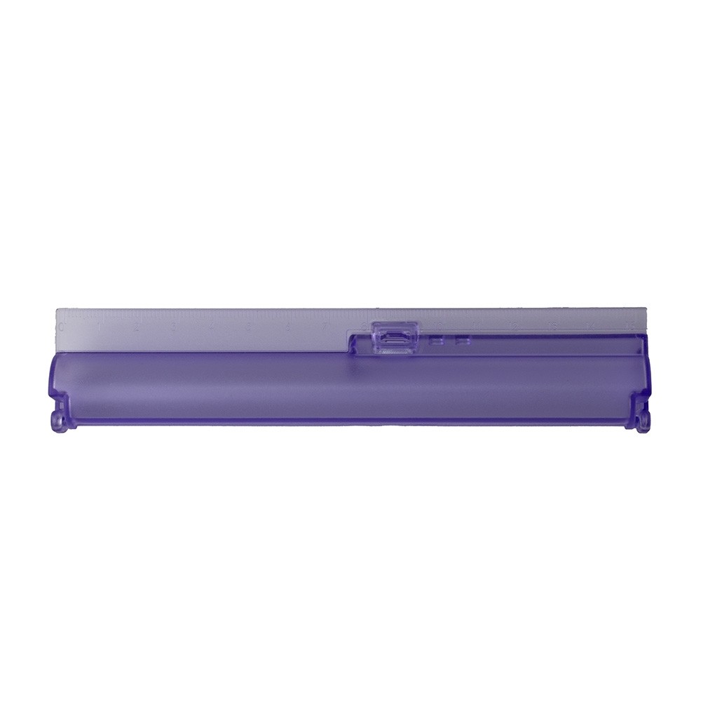 Estojo de plástico com régua de 15cm e compartimento para uma caneta. Não acompanha caneta.