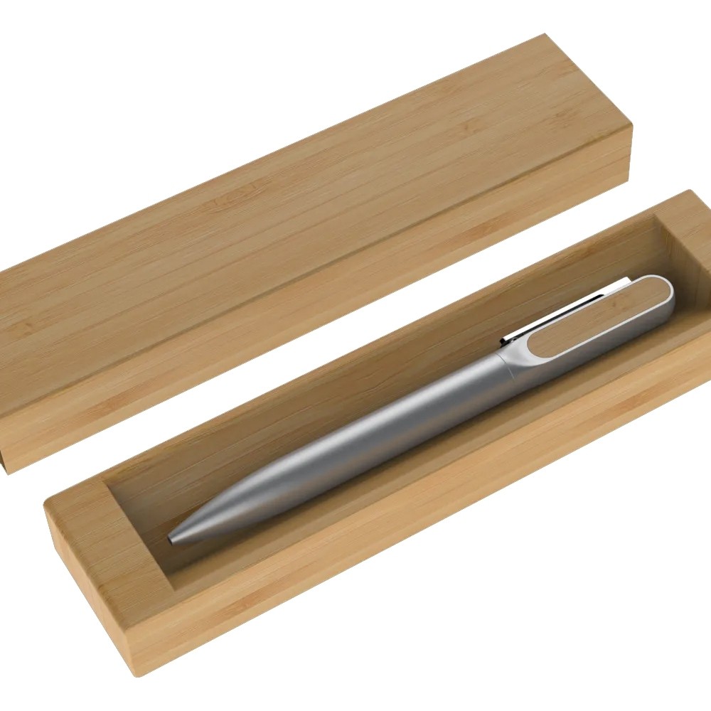 Estojo de papel para uma caneta com acabamento similar a bambu. OBS.: IMAGEM MERAMENTE ILUSTRATIVA, NÃO ACOMPANHA CANETA.