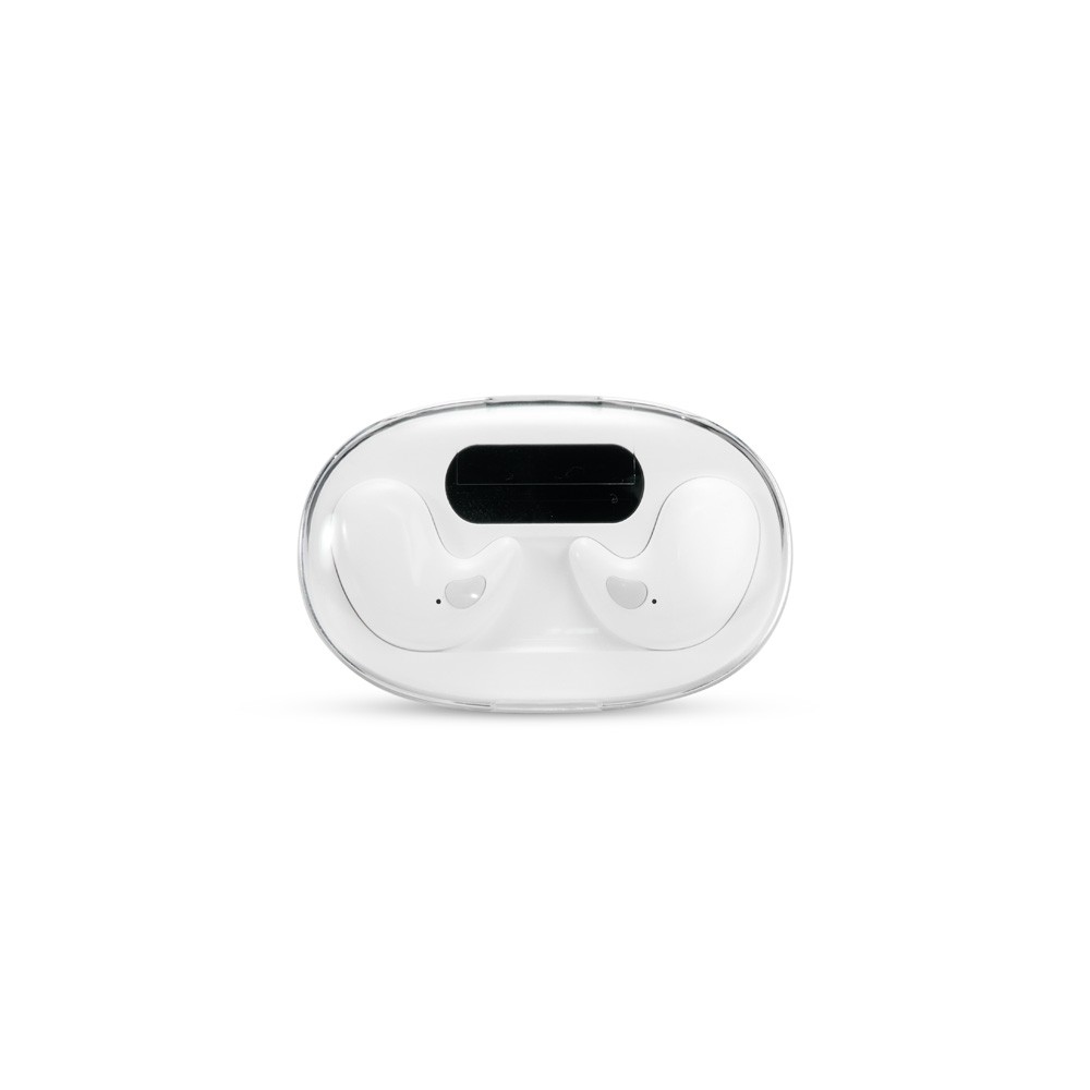 Fones de ouvido intra-auriculares sem fio, com estrutura leve e compacta em plástico e conexão via Bluetooth 5.3, garantindo estabilidade durante o uso. Possui estojo de carregamento com display de LED para visualizar o nível de carga. Acompanha cabo USB-C. Especificações: - Largura  4,2 cm - Comprimento  6,5 cm - Espessura  2,3 cm - Medidas aproximadas para gravação(CxL)  1,5 cm x 3 cm - Peso aproximado(g)  31
