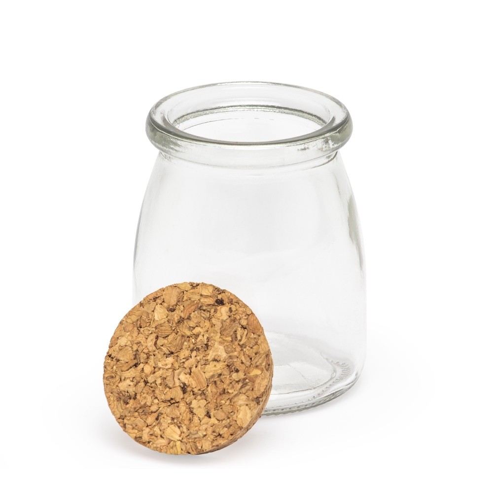 Frasco de vidro com capacidade de 200ml, tampa de cortiça.