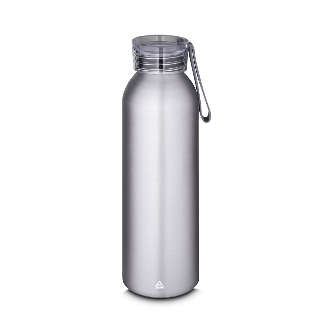 Garrafa de alumínio reciclável com capacidade para 640ml, possui tampa rosqueável de plástico e alça emborrachada