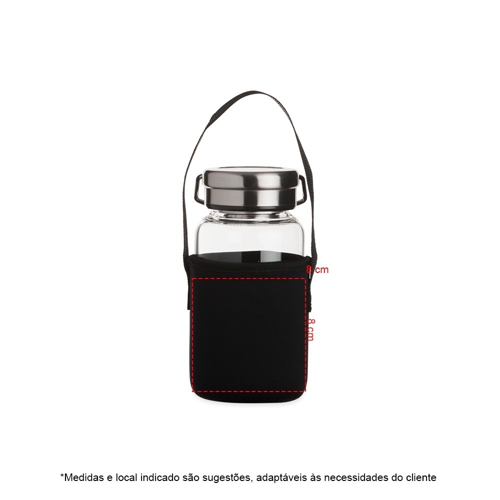 Garrafa de vidro borossilicato com capacidade de 650ml, acompanha peneira infusora e capa de neoprene com alça para transporte. Tampa de alumínio com alça para transporte. Especificações: - Altura  17,1 cm - Largura  8,6 cm - Circunferência  26,9 cm - Medidas aproximadas para gravação(CxL)  9 cm x 4 cm - Tamanho total aproximado(CxL)  Diâmetro bocal 5,2 cm - Peso aproximado(g)  350
