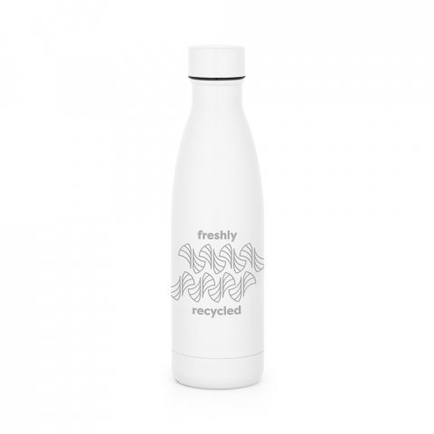 Garrafa térmica em aço inox 90% reciclado com parede dupla, isolada a vácuo e acabamento em mate 520 mL Garrafa térmica em aço inox 90% reciclado com parede dupla, isolada a vácuo e acabamento em mate. A tampa de rosca é à prova de vazamentos. Capacidade até 520 mL. Fornecido em caixa presente de papel kraft reciclado. Certificação EU Food Grade. ø70 x 255 mm