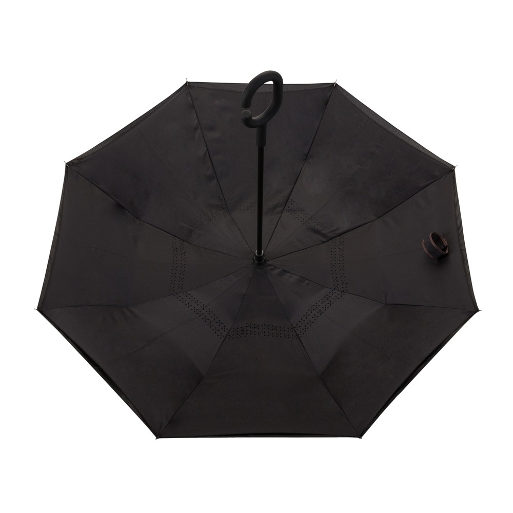 Guarda-chuva invertido com forro interno. Tecido de nylon impermeável preto, possui um mecanismo inovador permitindo que o usuário não se molhe ao entrar e sair de ambientes devido sua abertura invertida, quando feito o movimento para fechar as varetas inverterão para cima criando um formato circular impedindo a chuva de atingir o usuário, podendo “segurar” a chuva enquanto entra/sai de um ambiente e depois virando o guarda-chuva irá escorrer a água. Forro interno para preservação das 8 varetas, evitando contato com a água e assim prolongando seu tempo de uso sem enferrujar. Ao impulsionar o fechamento invertido fica mais rápido e prático o modo de secar e ser guardado, pode ser apoiado no chão que permanecerá em pé para escorrer a água. Pegador plástico fosco em formato C, botão acionador vermelho e fita com velcro(contorno marrom) para lacre.