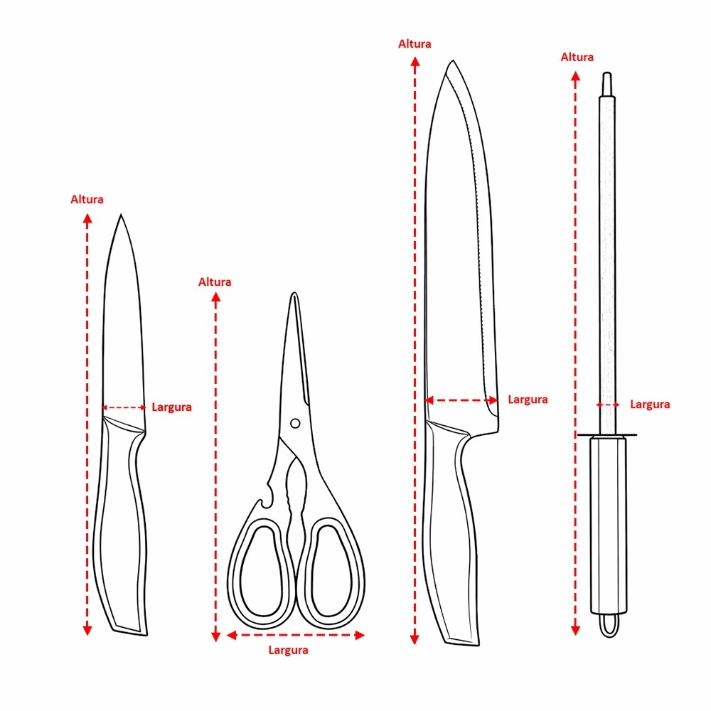 Kit churrasco formado por quatro itens em inox: uma faca de 8 polegadas, uma faca de 5 polegadas, uma chaira e uma tesoura com detalhes emborrachados no cabo. Acompanha embalagem em papelão.