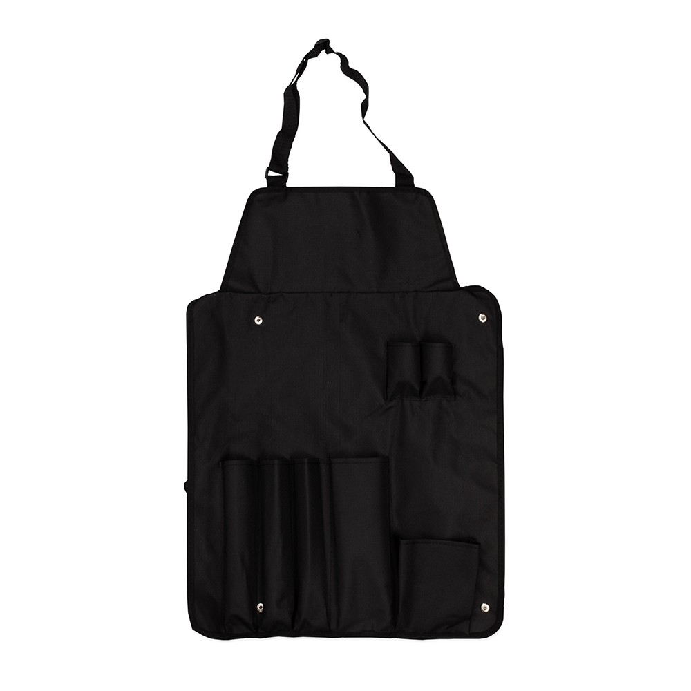 Kit churrasco 8 peças em estojo de nylon. Contém espátula, garfo, faca, pegador, saleiro, paliteiro, luva e avental (também utilizado como estojo). Talheres de inox com acabamento de madeira e avental de nylon com alça ajustável – possui botão e alça com fivela para lacre.