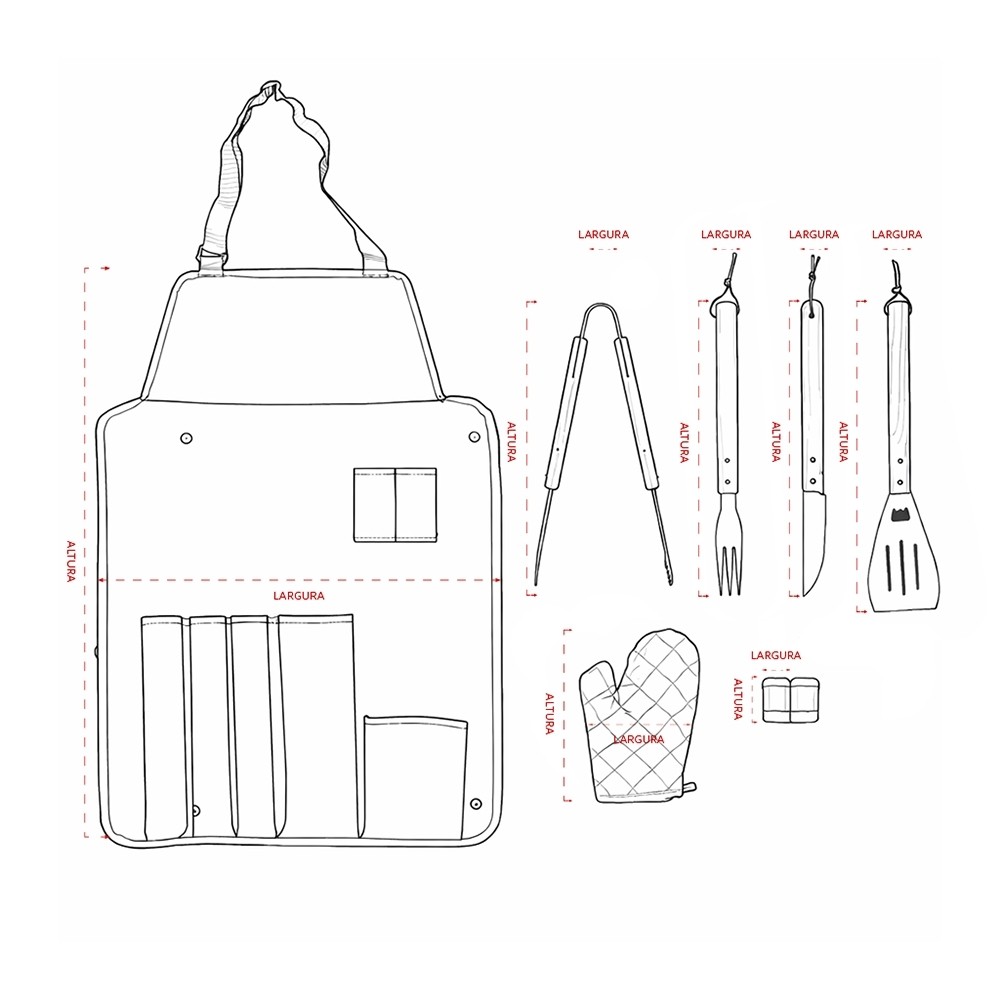 - Medidas aproximadas para gravação(CxL) Avental 8,5 cm x 23 cm/ Saleiro 1,5 cm x 1 cm/ Luva 1 cm x 1,5 cm/ Pegador 9,5 cm x 1,5 cm / Espátula 9,5 cm x 1,3 cm/ Garfo 9,5 cm x 1,3 cm/ Faca 16 cm x 1,3 cm