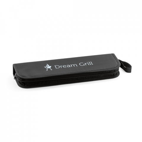 Kit churrasco em estojo de 210D. Composto por 3 utensílios em aço inox e madeira de Seringueira: faca chefe, pinça e garfo. Certificação EU Food Grade. Estojo: 350 x 130 x 20 mm