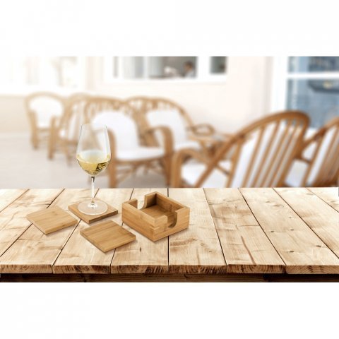 Conjunto de 4 porta copos em bambu com caixa aberta. Fornecido em caixa presente de papel kraft reciclado. A cor e o resultado da impressão nos materiais naturais pode variar entre produtos. 115 x 115 x 35 mm | Base copo: 100 x 100 x 6 mm | Caixa: 119 x 121 x 56 mm