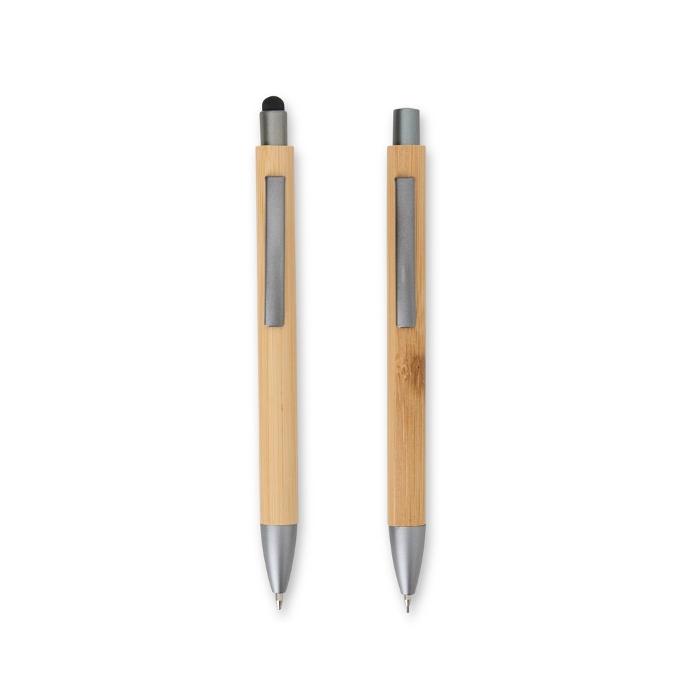 Nosso Kit Ecológico de Caneta e Lapiseira de Bambu é excelente para quem busca um toque sustentável no dia a dia. A lapiseira possui acionamento por clique, e a caneta conta com carga esferográfica azul de 1.0mm e função touch para quem precisa de toques precisos em dispositivos. Além disso, acompanha uma embalagem que imita bambu. Uma ótima escolha para presentes corporativos ou para quem ama escrever sem abrir mão da consciência ecológica! Especificações: - Largura  4 cm - Profundidade  2 cm - Comprimento  17 cm - Medidas aproximadas para gravação(CxL)  15,5 cm x 2,5 cm / Lapiseira 3,5 cm x 0,5 cm / Caneta 3,5 cm x 0,5 cm - Tamanho total aproximado(CxL)  Caneta 14,2 cm x 1,3 cm/ Lapiseira 13,9 cm x 1,3 cm - Peso aproximado(g)  39