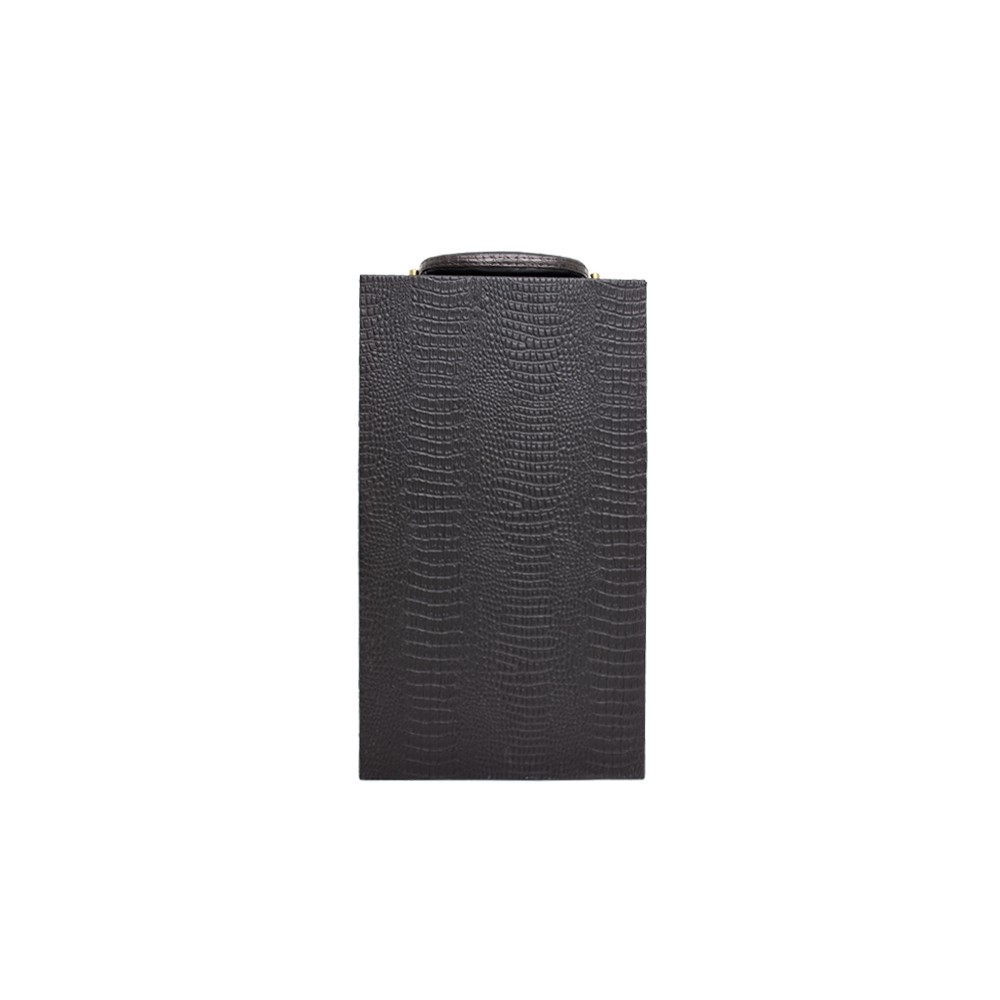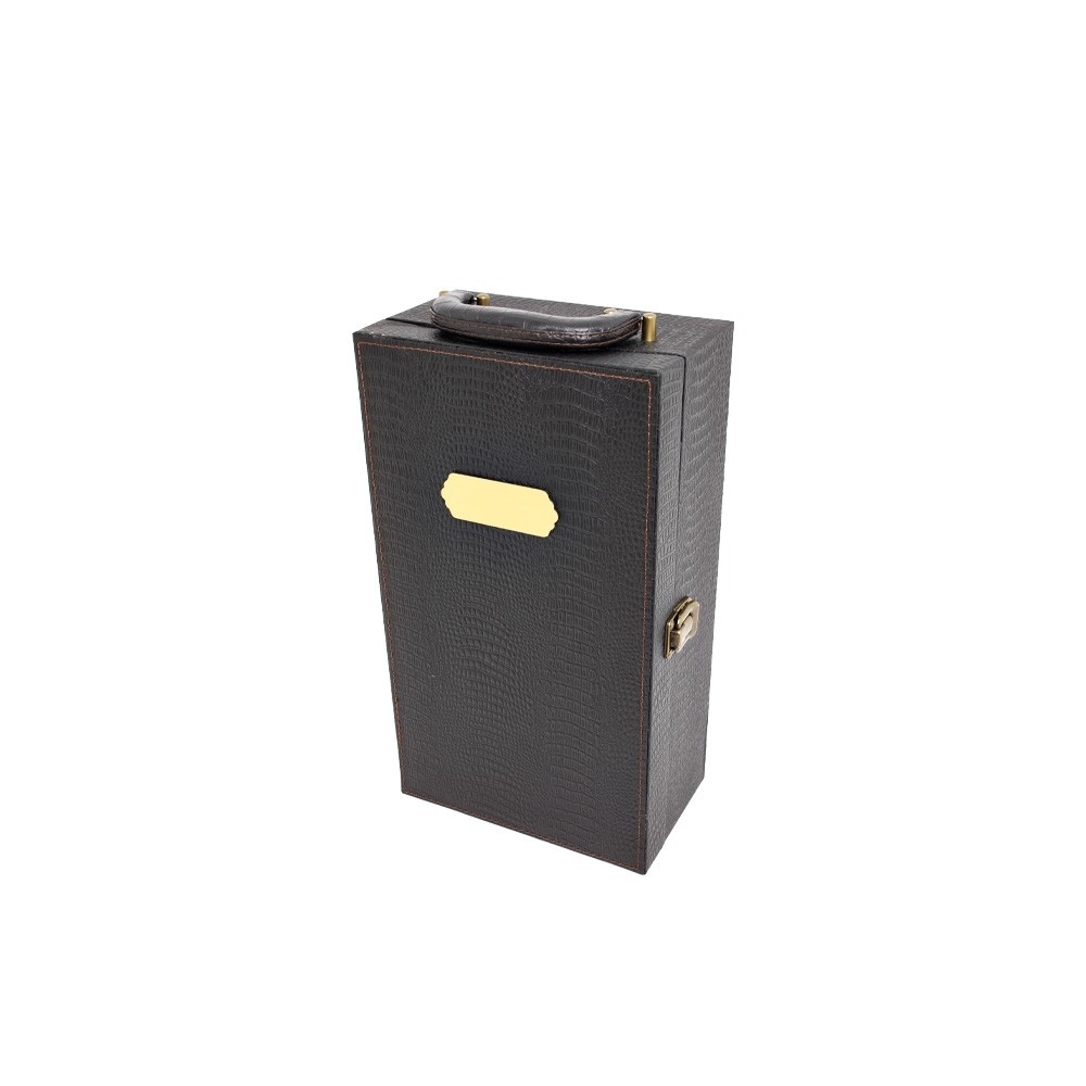 Kit vinho 4 peças em maleta de couro sintético texturizada. Contém saca-rolhas metálico, bico condutor com tampa, cortador de lacre e wine collar. Maleta com alça, trava de segurança e plaquinha plástica fixa com fita dupla face. Área interna revestida de veludo com suportes de nylon com velcro e duas repartições para garrafas.