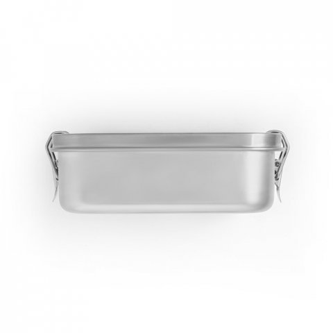 Marmita hermética robusta em aço inox 90% reciclado com fivelas laterais de segurança. Capacidade até 750 mL. Fornecida em caixa presente de papel kraft reciclado. Certificação EU Food Grade. 170 x 119 x 57 mm