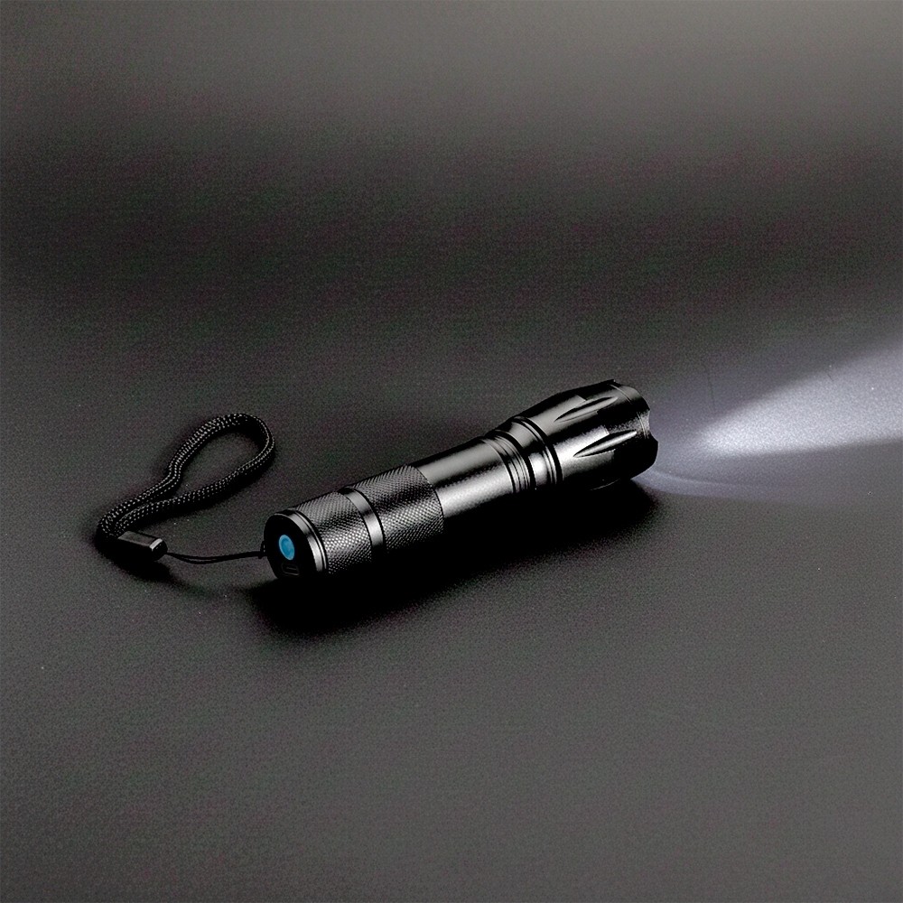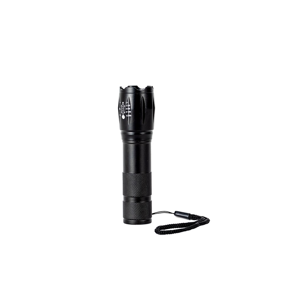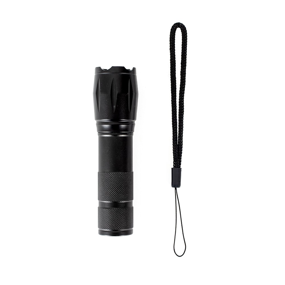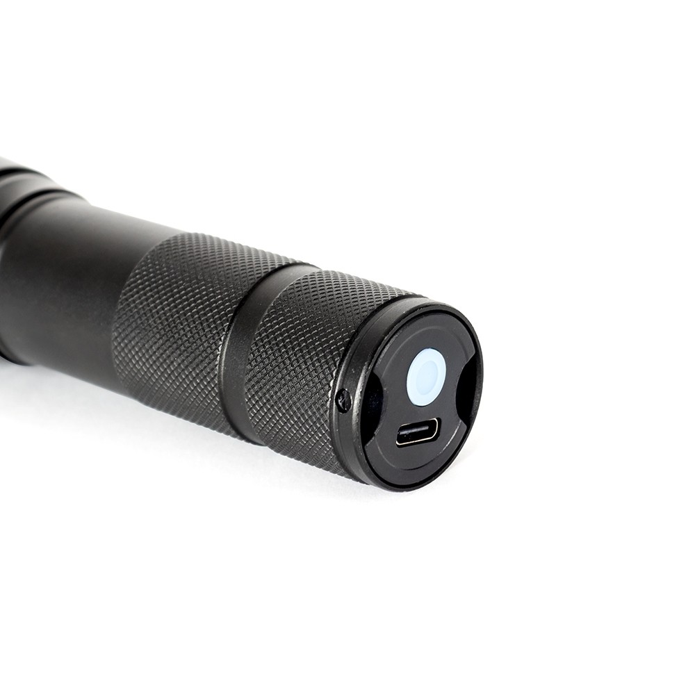 Lanterna recarregável em LED com estrutura metálica. Possui mecanismo de ajuste de zoom, três níveis de luz, botão liga/desliga e entrada USB-C para recarga. Acompanha cordão de nylon e cabo USB-C.