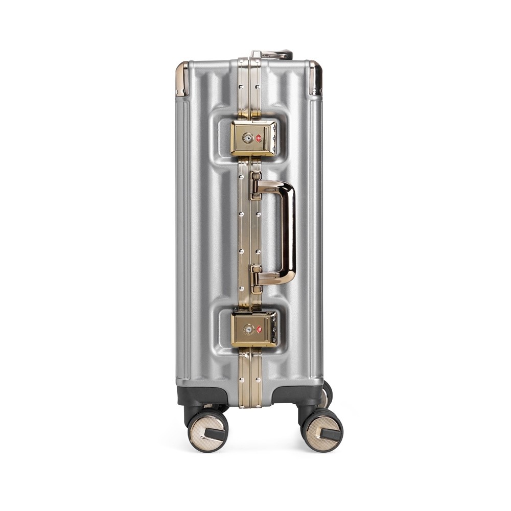 Mala de viagem 30 litros feita em plástico com acabamento em alumínio, contém cadeado numérico TSA. Compartimentos internos com bolso telado, bolso plástico para itens molhados e cinta compressora para roupas. A mala possui duas alças de mãos, puxador retrátil com regulagem de tamanho, suporte porta bolsa, quatro rodinhas 360º e apoios laterais. Especificações: - Altura  57 c/roda cm - Largura  36,5 cm - Profundidade  21,9 cm - Medidas aproximadas para gravação(CxL)  38 cm x 28 cm - Peso aproximado(g)  3084