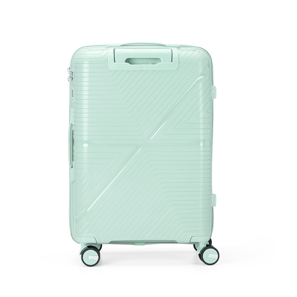 Mala de viagem em plástico resistente com capacidade de até 67 litros. Possui espaço interno com divisória, que contém bolso em tela e outro espaço com cinta compressora para organização de objetos. Conta com duas alças de mãos, uma superior e outra lateral, quatro apoios laterais, quatro rodinhas com giro em 360º, puxador com ajuste de nível e cadeado numérico TSA.
