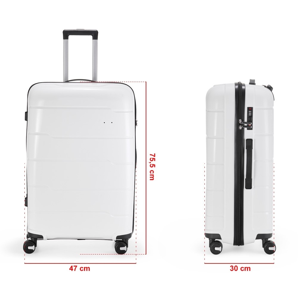 Mala de viagem 95 litros em plástico PP (casca dura), contém cadeado numérico TSA. Compartimentos com bolso telado e cinta compressora para roupas. A mala possui duas alças de mão, puxador retrátil com regulagem de tamanho, quatro rodinhas 360º e apoios laterais. Acompanha placa para personalização. Especificações: - Altura  75,5 cm - Largura  47 cm - Profundidade  30 cm - Medidas aproximadas para gravação(CxL)  1 cm x 3,8 cm - Peso aproximado(g)  4045