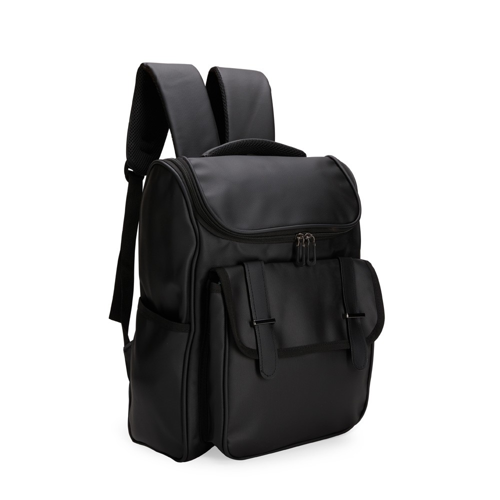 Mochila confeccionada em couro sintético impermeável com capacidade de até 18 litros. Possui compartimento interno para notebook de até 13 polegadas. Apresenta compartimento frontal com par de fivelas e fechamento em botões magnéticos, além de dois bolsos laterais. Possui área das costas e alças de mão e de costas com revestimento em tecido respirável.