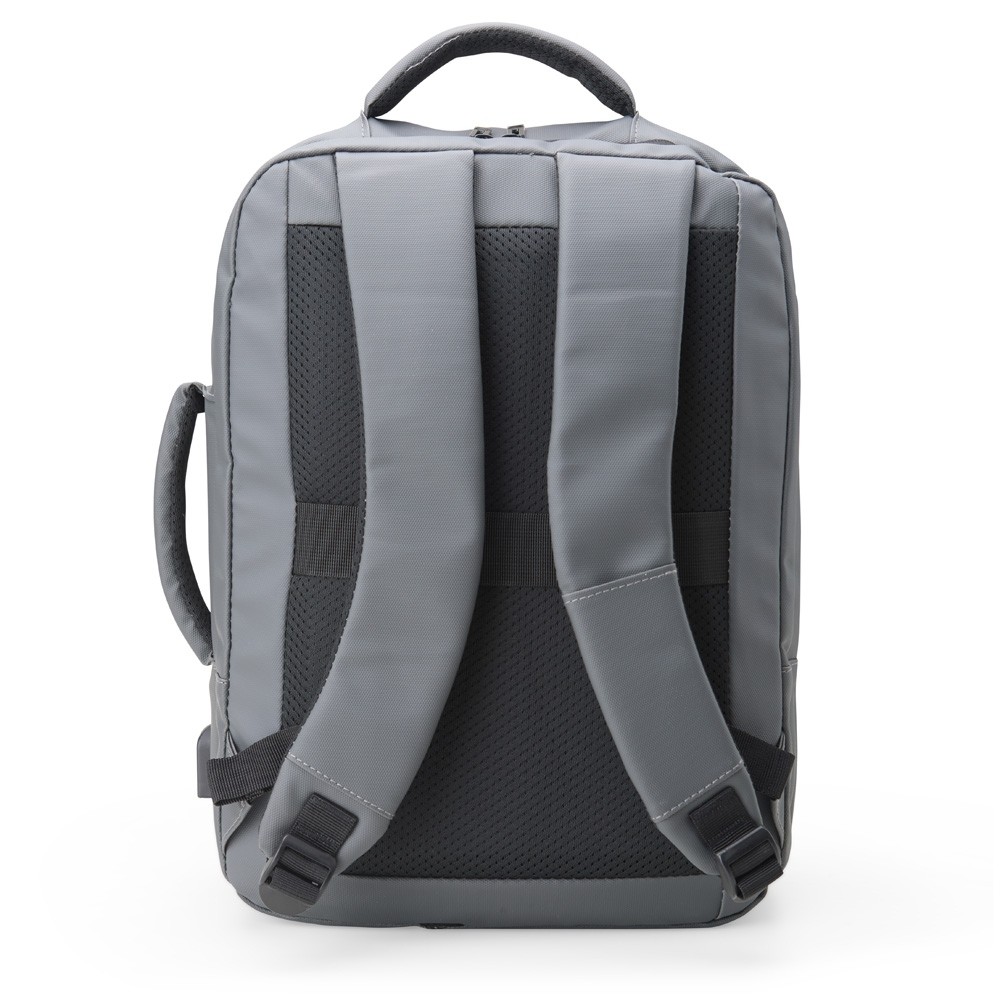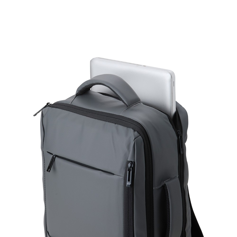 Mochila em couro sintético 25 litros resistente à água com quatro compartimentos, sendo o principal com bolso para notebook 15,6 e tablet 10. Com divisórias internas para acessórios, a mochila possui suporte externo usb, alça para encaixe em malas de viagem e duas alças de mãos, sendo uma delas lateral para o transporte da mochila no modo pasta.